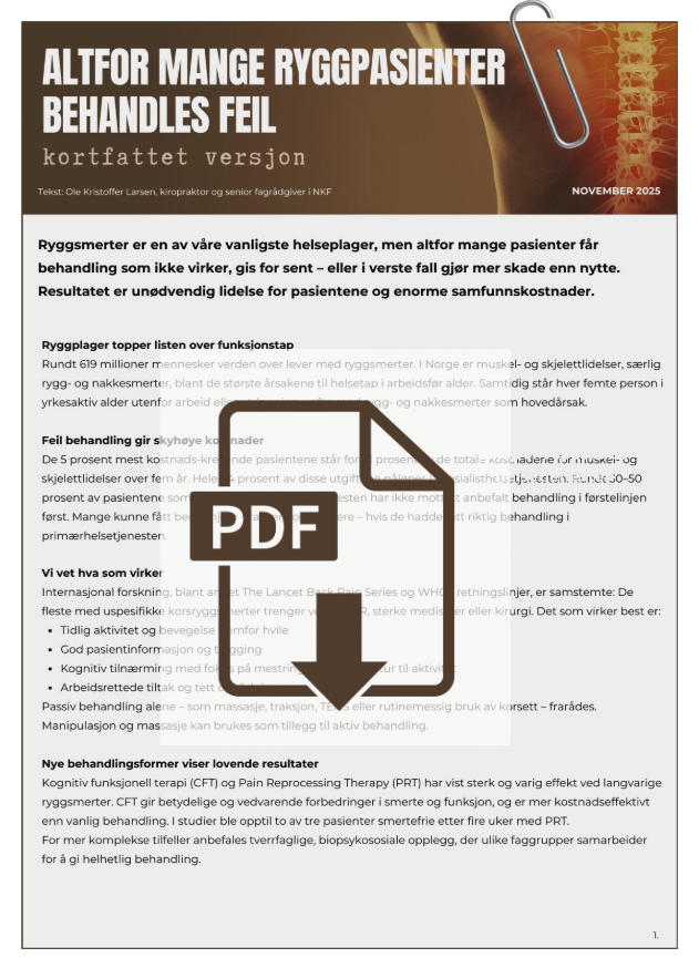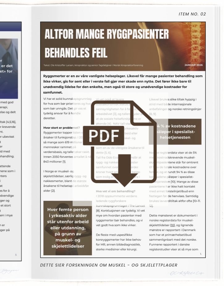 Ryggplager er Norges største årsak til smerte, sykefravær og trygd. Vi har kunnskapen. Vi har fagmiljøene. Vi har retningslinjene. Men likevel behandles pasienter feil — gang på gang.