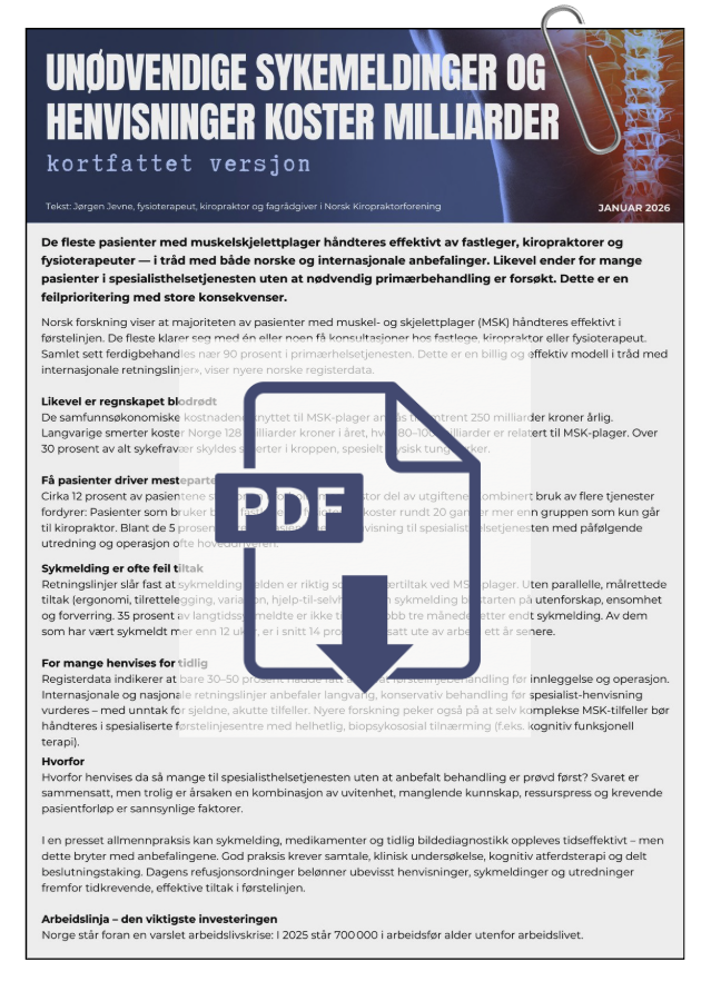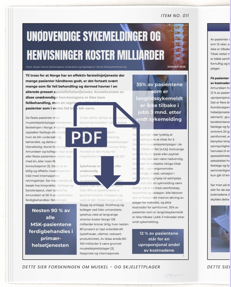 Her presenterer vi to analyser om hvordan feil intensiver og feil praksis gjør muskel- og skjelettpasientene sykere og koster samfunnet milliarder. Her kan du lese om hva som må endres for å gi pasienter riktig hjelp, raskere og mer effektivt.